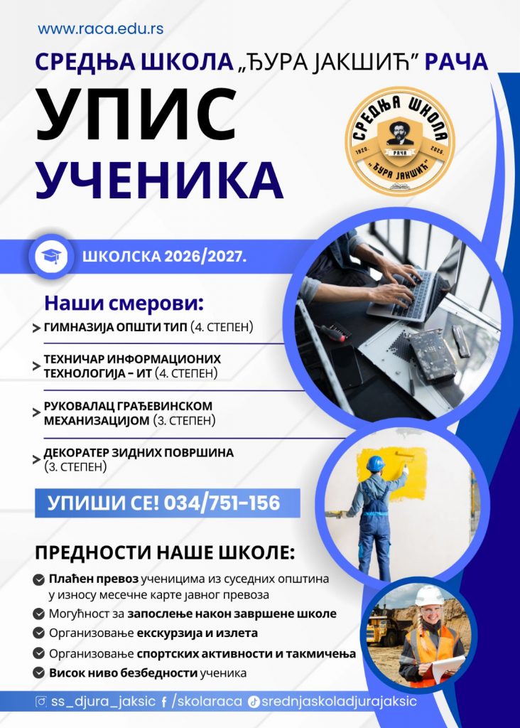 Средња школа „Ђура Јакшић” у Рачи позива све будуће средњошколце да постану део наше школе и изаберу један од атрактивних образовних профила.